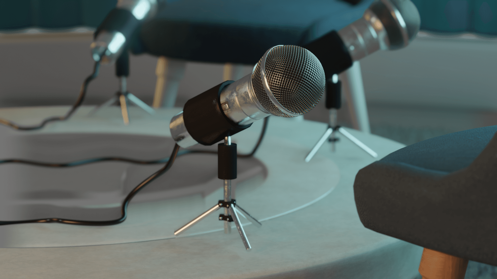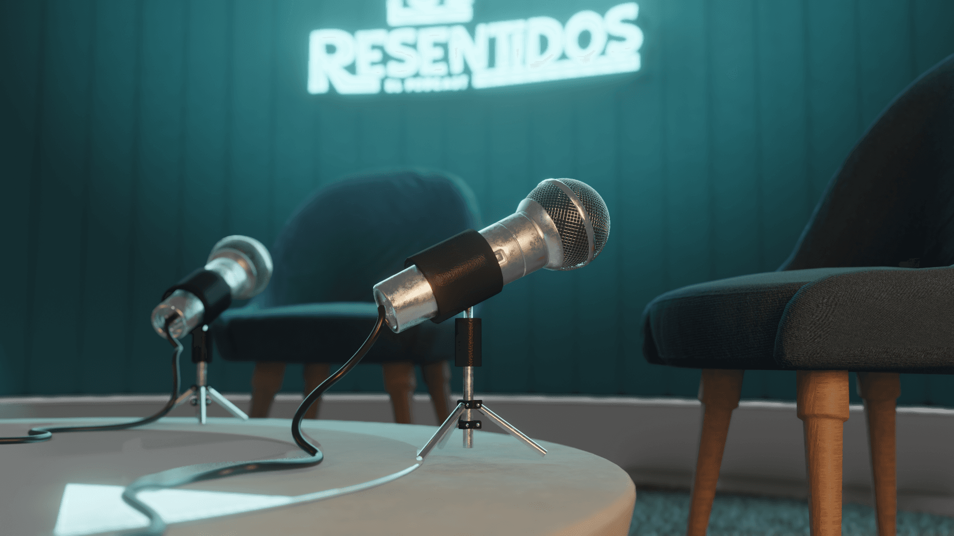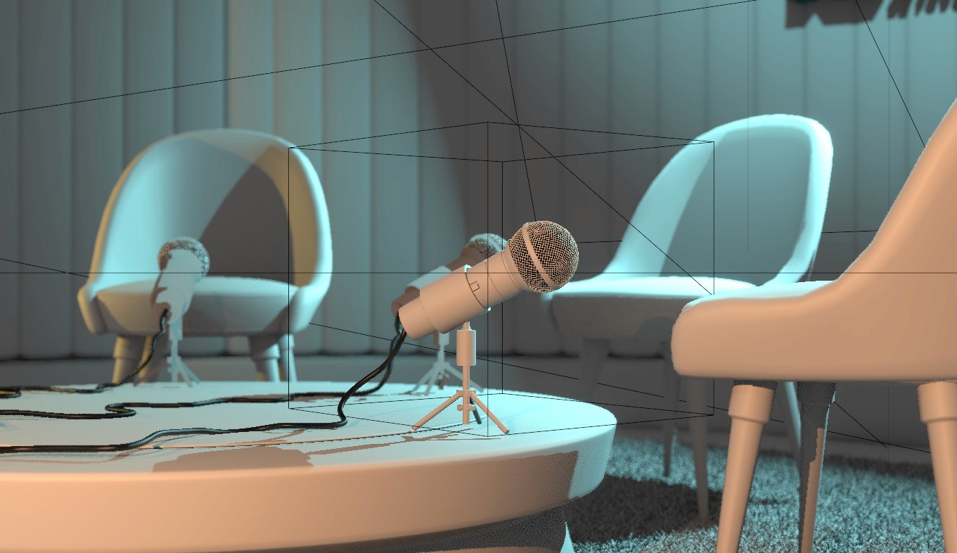 Due to the volume of shots and a fast turnaround, the rendering was done in Eevee, which allowed for real-time previews and faster delivery. To maintain a high level of realism, we crafted all textures from scratch — including realistic skin, a fiber-based carpet created with particle systems, and a metallic microphone. We also designed the lighting setup to convey a closed, podcast-like environment with a signature blue neon glow. Special care was taken to make the space feel immersive and cohesive, despite the technical limitations of the render engine.