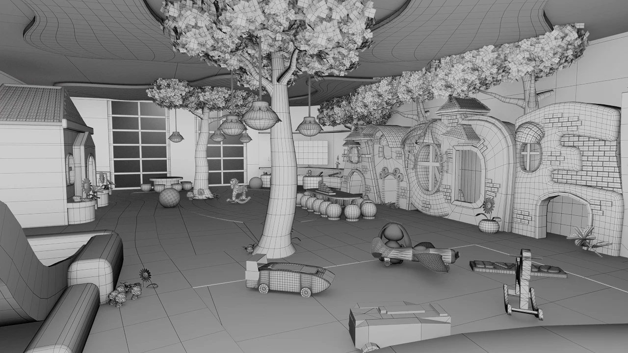 Create a full 3D composition and render of a children’s set for Art Peak Animation Studios, showcasing creativity and technical skill while aligning with the studio’s references and style.